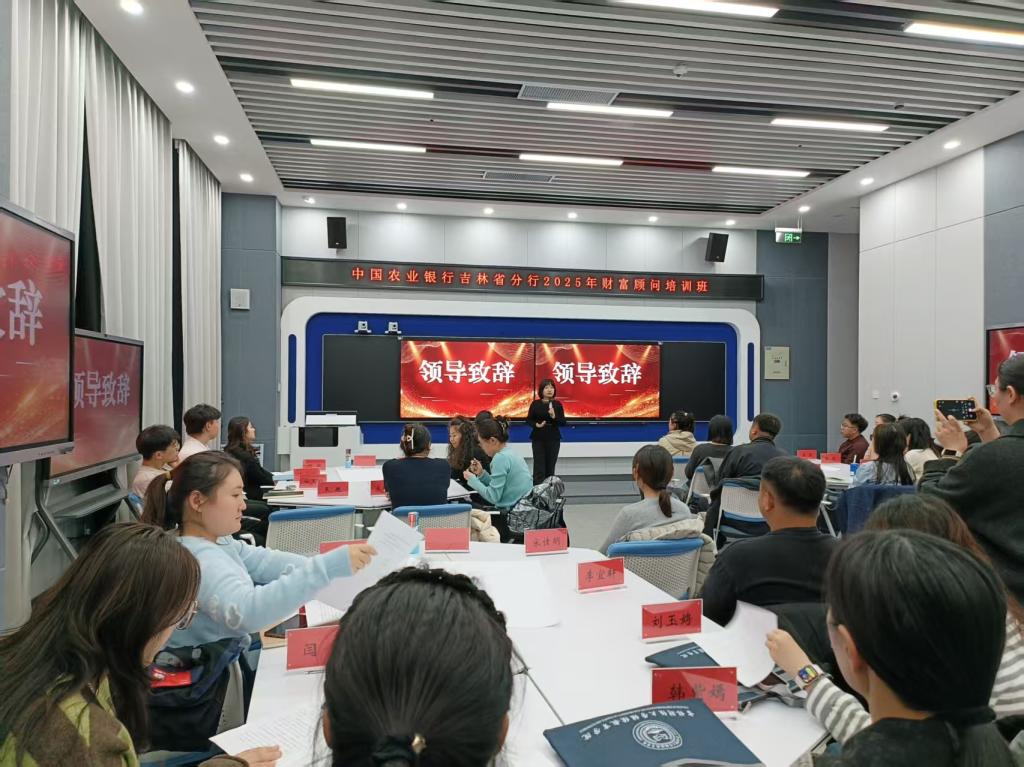 2025 年 10 月 26 日 18 时,中国农业银行吉林省分行 2025 年财富顾问培训班在我校顺利开班。农业银行吉林省分行相关领导、我校继续教育学院负责人,以及来自全省农行系统的 44 名骨干人员共同参会,正式开启为期 7 天的全封闭培训。